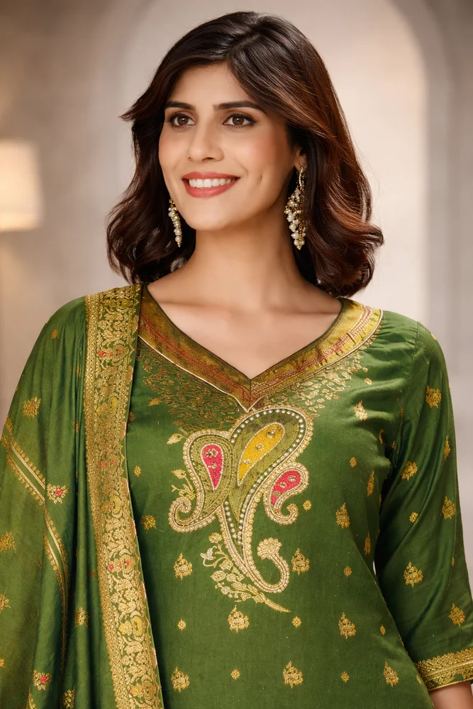 Step into elegance with our Emerald Rajwadi Premium Suit Set, designed for women who love timeless tradition with a modern touch. Crafted in a rich green tone, this outfit features delicate zari motifs and a beautifully detailed neckline that enhances your festive look.