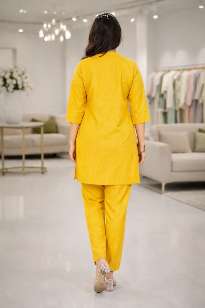 This golden co-ord set is perfect for women who love classy and elegant outfits. Whether it's a festive celebration, office wear, or a casual day out, this outfit will make you stand out effortlessly.