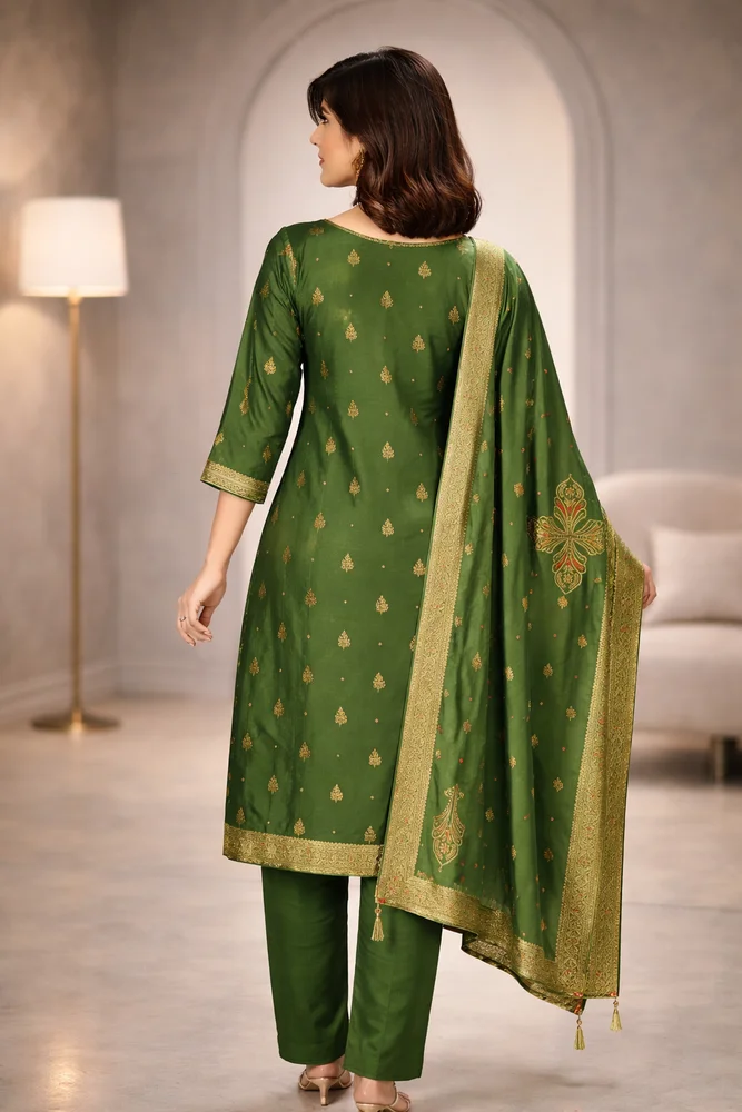 Step into elegance with our Emerald Rajwadi Premium Suit Set, designed for women who love timeless tradition with a modern touch. Crafted in a rich green tone, this outfit features delicate zari motifs and a beautifully detailed neckline that enhances your festive look.